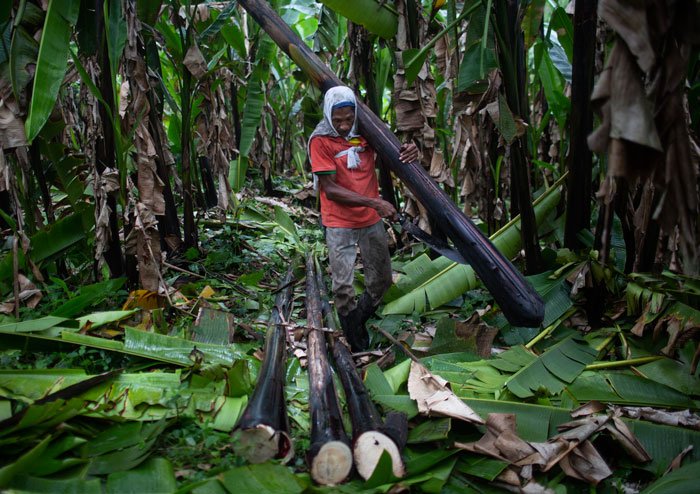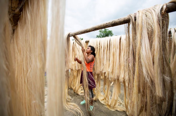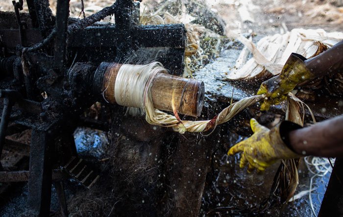 El hombre separa las láminas del tallo de abacá. Esta actividad, que se conoce como tucsear, es una de las que integra el proceso de extracción de la fibra, compuesto por la tumba de la planta, el deshoje, el tucseo, el acarreo en burro, el deshilachado en la máquina y el secado. Un operario introduce la fibra de abacá en la máquina para deshilacharla, antes de que sea secada y empaquetada para exportarla al resto del mundo. La máquina es propiedad de Furukawa, pero es el arrendatario quien tiene que pagar por la gasolina que la hace funcionar, así como por las reparaciones cuando se estropea.