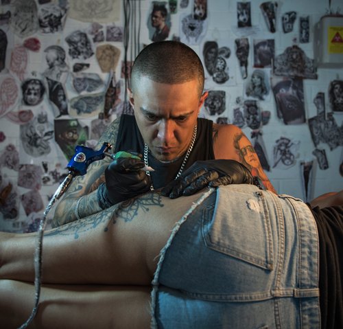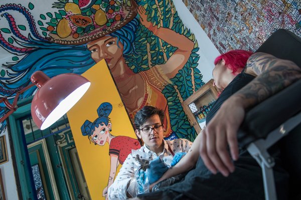 En Quito hay unos 70 estudios de ta­tuaje abiertos al público. Uno de los loca­les que lleva más tiempo funcionando es Precision Tattoo, que recientemente con­memoró veinte años en el medio. Al frente de esta empresa familiar en la que trabajan tres hermanos, está Christian. Recuerda que, en sus comienzos, “venían a casa a tatuarse, o se hacía en la calle. Principal­mente eran hombres y lo que más pedían era escorpiones, corazones, cristos…” “Desde hace más o menos una década las mujeres se sumaron a esta moda, y hace unos años, se incorporaron al oficio las primeras tatuadoras”, prosigue.