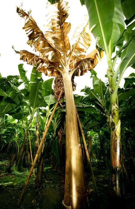 4, 5. 3° 16° 0° S, 79° 58° 0° W, proyección de diapositivas, árbol de banano cubierto en pan de oro, 2010.