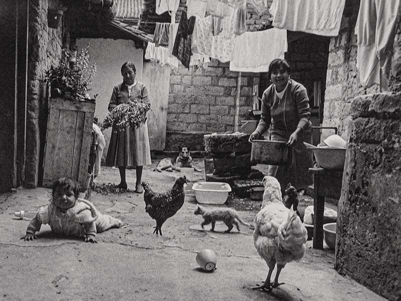 En el patio interno de una casa hay dos mujeres, cinco animales y un bebé. Es un patio sencillo, de bloque y piso de cemento; distinguimos una lavandería de piedra, un par de plantas y ropa colgada en alambres. Una mujer sostiene un atado de hierbas, quizás medicinales; otra mujer sostiene un balde, quizás para lavar la ropa. El bebé gatea o se arrastra por el suelo junto a tres gallinas y un gato. Al fondo vemos un perro que contempla la escena. Hay belleza en la cotidianidad. Hay belleza en el solo hecho de mirar esta escena tan doméstica, donde cada elemento remite a los cuidados.