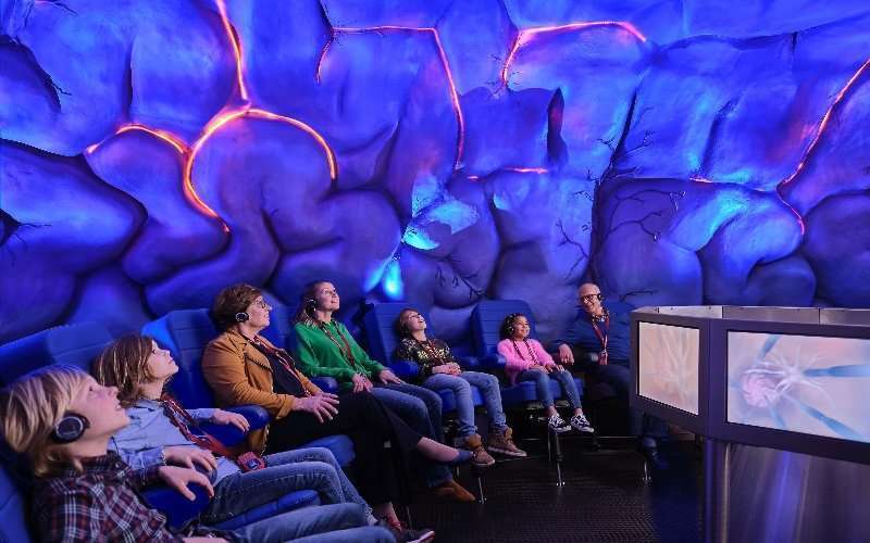 Luego, se puede disfrutar del ‘teatro útero’, donde animaciones proyectan las carreras de los espermatozoides hacia un óvulo. A través de gafas virtuales, los presentes son testigos del proceso mágico de la creación de la vida. Una vez terminado este evento, los asientos se elevan hasta un piso superior donde se despliegan animaciones adicionales sobre cómo funcionan los intestinos.
