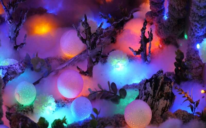 13 piezas que llevan a los espectadores a dialogar con los diferentes objetos luminosos. Un acto íntimo entre fosforescentes flores, esferas y espacios con pequeñas y tenues irradiaciones.