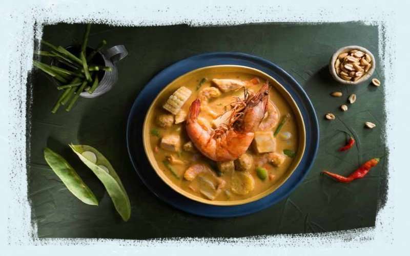 Cuando el caldo empiece a tomar sabor, agregue las bolas de verde untadas con un poco de achiote y la pasta de maní. Luego, añada el plátano maduro costeño; cuando las verduras estén cocidas, incorpore el pescado, los camarones y los langostinos. Sirva espolvoreando abundante cilantro.
