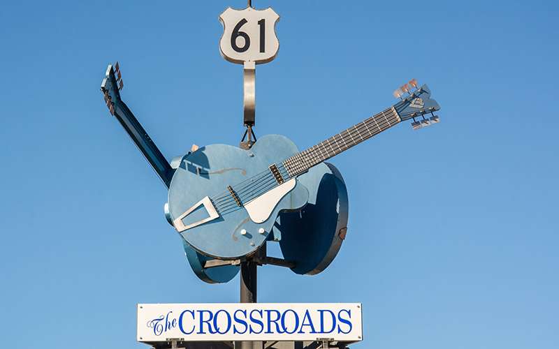 Monumento a Crossroads con tres guitarras azules gigantes marcando el cruce donde la leyenda del blues Robert Johnson le vendió su alma al diablo. Foto: Shutterstock.