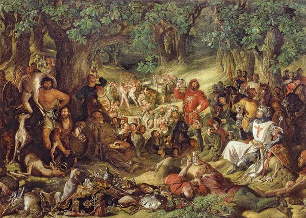 Inglaterra, que por entonces —finales del siglo XII— tenía menos de tres millones de habitantes, era un país lleno de bosques, en los que encontraban refugio y modos de vida los perseguidos por la ley. Y allí, en los bosques de los montes de Sherwood, el joven hidalgo, que era célebre en la comarca por su destreza con el arco y las flechas, se ocultó y, con el pasar de las semanas, formó una pequeña banda (Lady Marian, Friar Tuck, Little John, Will Scarlett y Allan A’Dayle), con la que se dedicó a robar a los viajeros de riquezas mal habidas y distribuir su botín entre los pobres. Y así, perseguido por los soldados de Juan sin Tierra pero admirado por la gente humilde, a la que tanto ayudó, esperó el regreso de su rey, Ricardo Corazón de León.